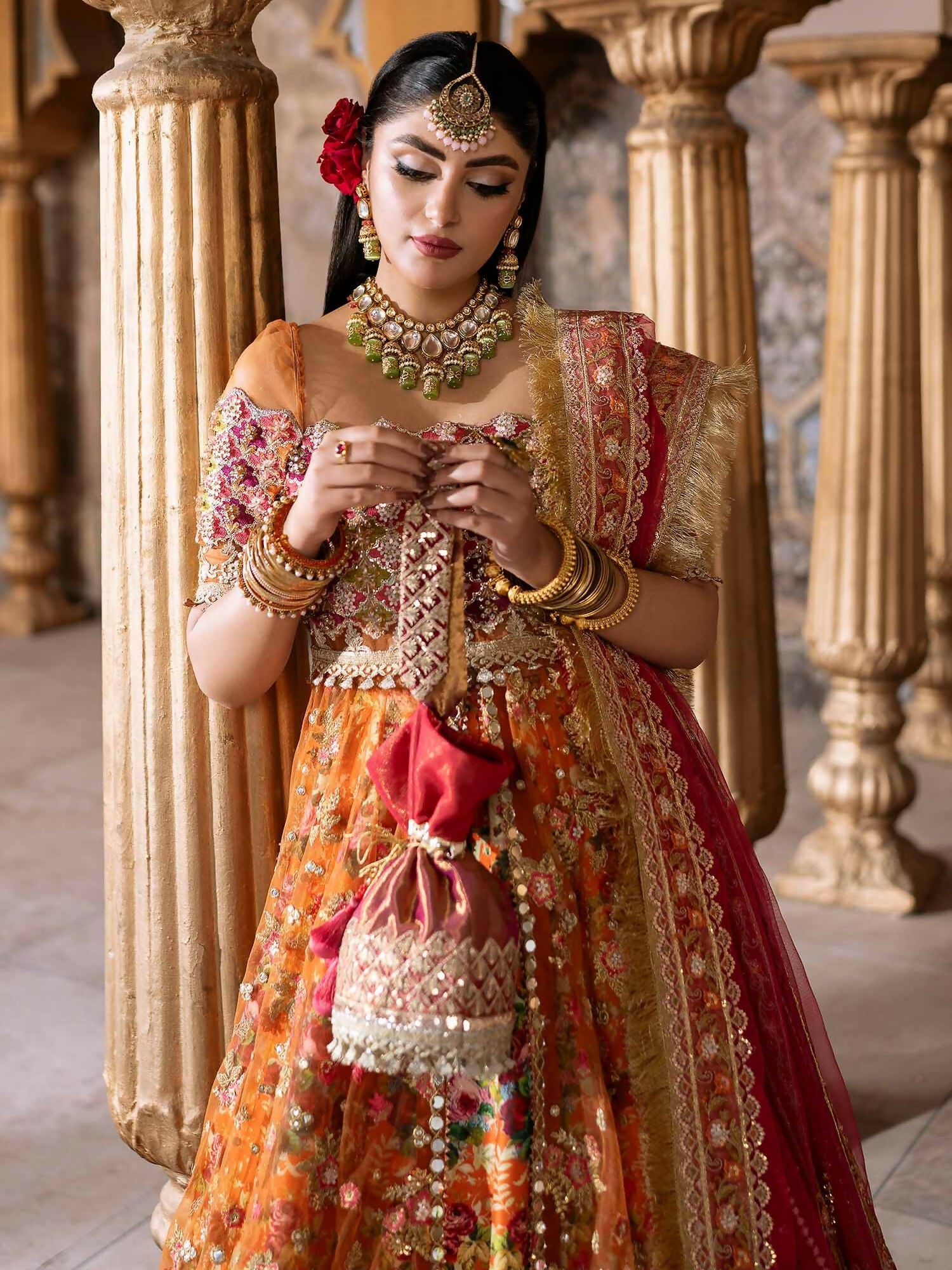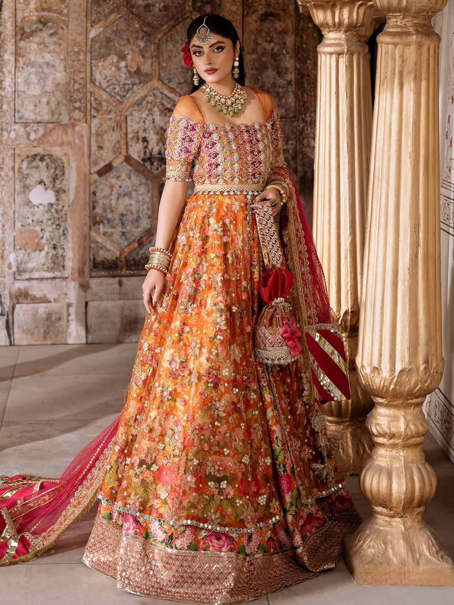 This Ensemble stands out as an embodiment of sophistication and luxury, crafted with pure finesse and elegant floral embroidery and detailed embellishment. A glorious orange net and printed silk serves as the canvas for this delectable design, with deftly embellished stones and sequence on the neckline and modish sleeves creating a supremely classy silhouette. The timeless design , intricate stitching details and embroidered tecniques are used to make this marvelous silhoutte . paired with a net embroiderde dupatta and silk lehnga.