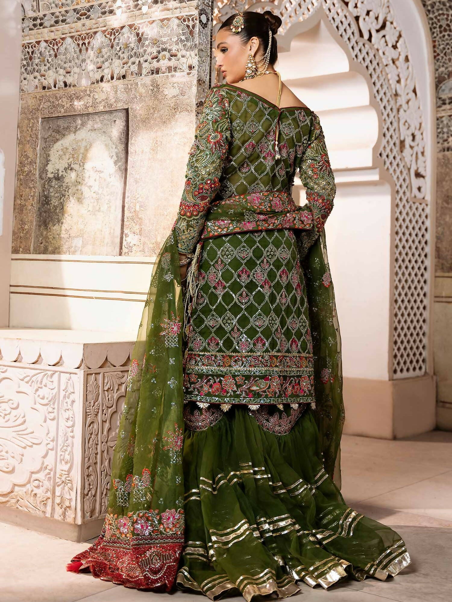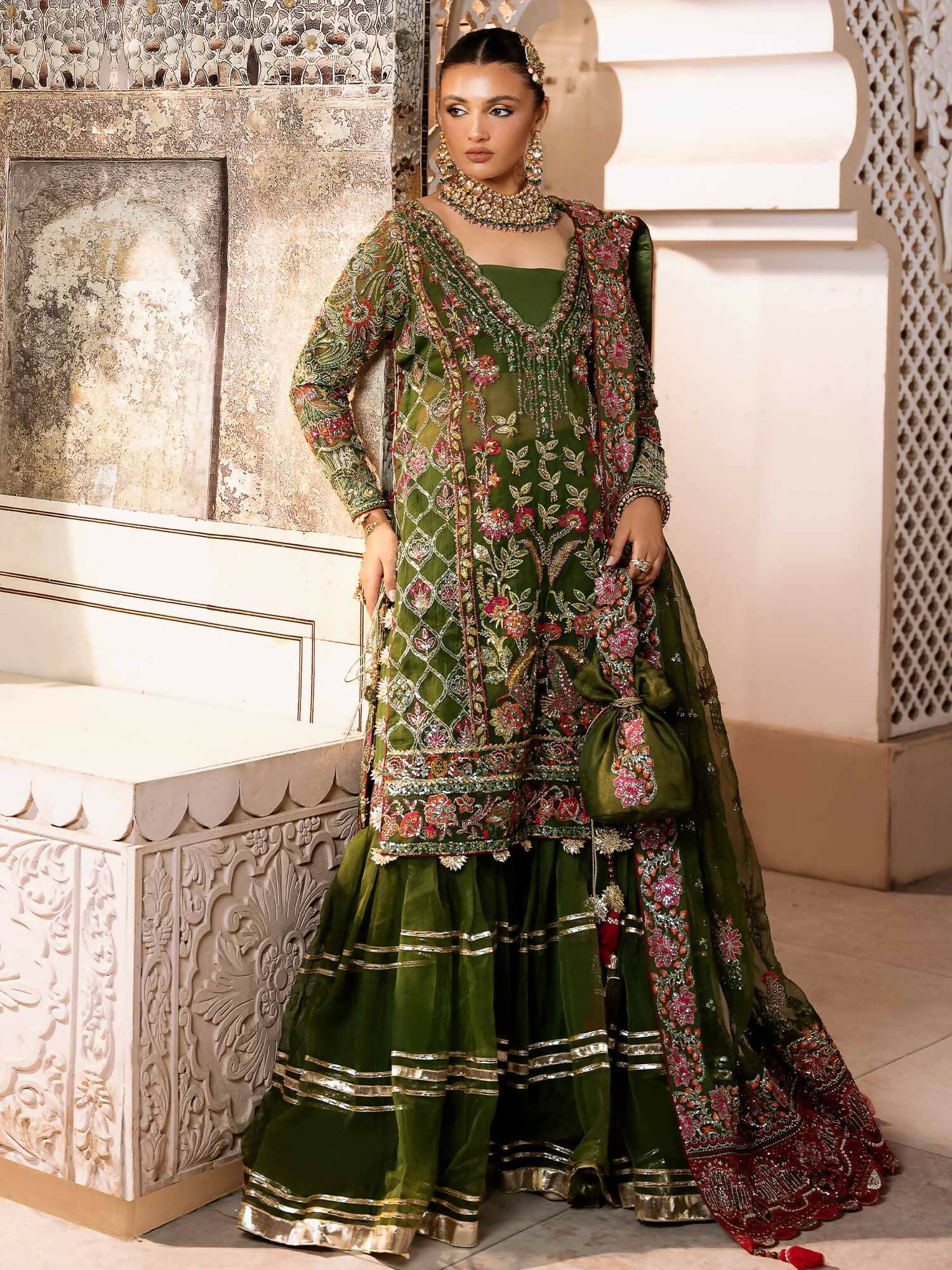 “ZARIA” a breathtaking ensemble that is a genuine work of art in rich shades of pinks and gold on olive green canvas. organza got sharara pants create a chic foundation, beautifully complemented by an exquisite organza shirt . This shirt is meticulously adorned with precious stones ,pearls,sequence and dhabka , exuding an air of timeless elegance. “zaria” is a harmonious blend of grace and tradition, making it the perfect choice for the young generation who seek both sophistication and a connection to their heritage . organza dupatta with four side embroiderd borders is paired to complete this ensemble. The price includes a complete set comprising shirt, inner, Shara pant, and dupatta.