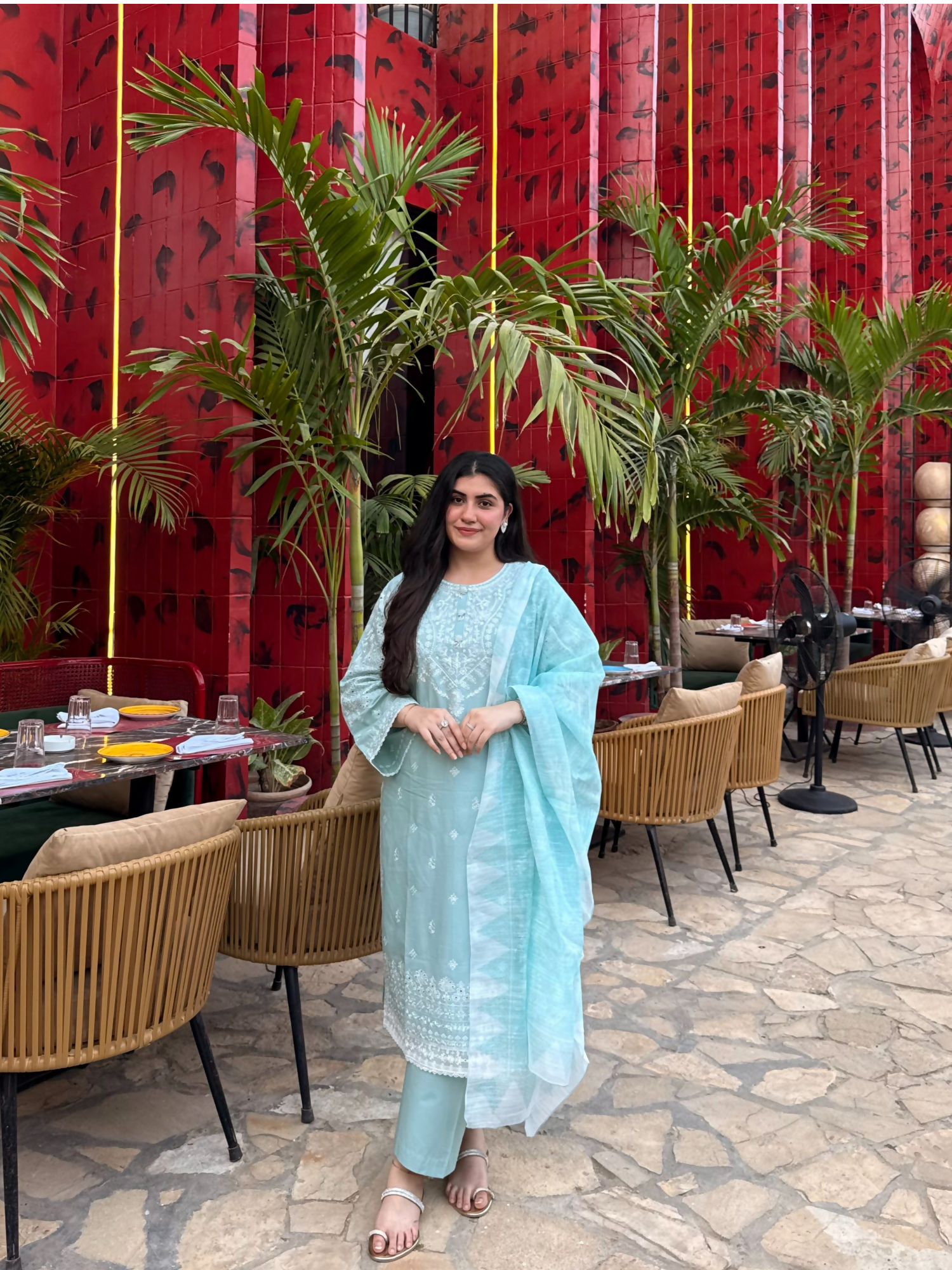 Immerse yourself in serenity with Aqua Reverie, a tranquil aqua ensemble adorned with delicate white and pastel embroidery. Paired with a softly printed organza dupatta and straight cotton trousers, it radiates timeless elegance and refined winter sophistication.