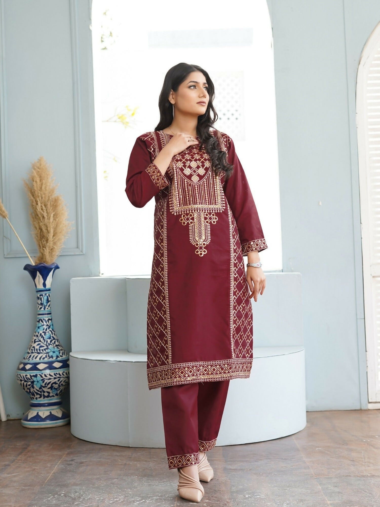 This 2-piece kurta set from Stylish Collection Aaraish blends festive charm with year-round comfort. Designed in a rich maroon hue, the embroidered long cotton kurta features a regular fit paired with matching straight trousers. The soft, breathable cotton fabric ensures ease and durability.