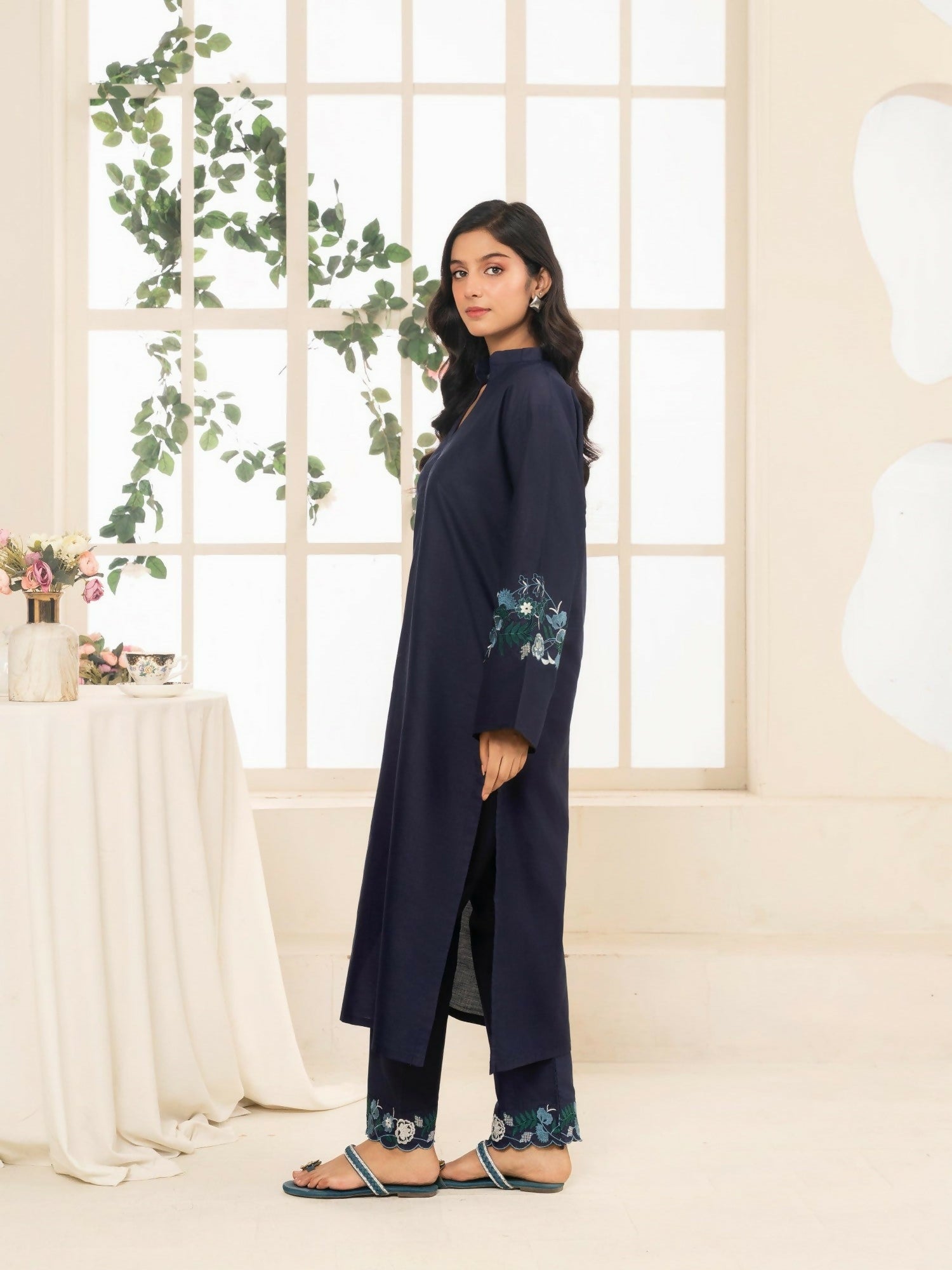 This 2-piece kurta set from Stylish Collection Aaraish offers a perfect balance of comfort and sophistication. Crafted from breathable cotton, the navy blue embroidered long kurta features a regular fit that drapes gracefully. Paired with matching straight cotton trousers, this set is ideal for daily wear and casual summer occasions. The lightweight fabric ensures coolness and comfort throughout the day, making it a versatile addition to your summer wardrobe.
