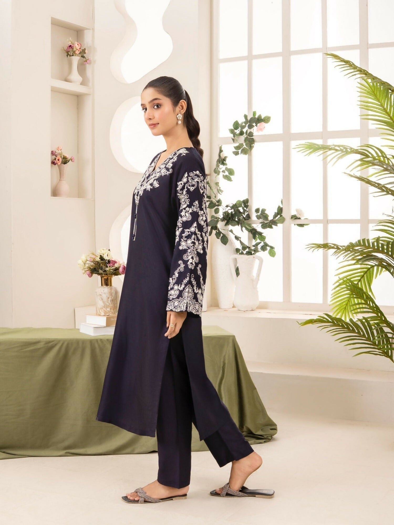 Elevate your summer style with this navy blue linen embroidered 2-piece kurta set. Crafted from premium linen, the outfit offers both sophistication and comfort. The long kurta and straight trouser combination create a graceful silhouette, while the linen fabric’s hollow flax fibers allow air to circulate—keeping you cool during warm days. Ideal for daily or casual wear, this outfit blends elegance with ease.