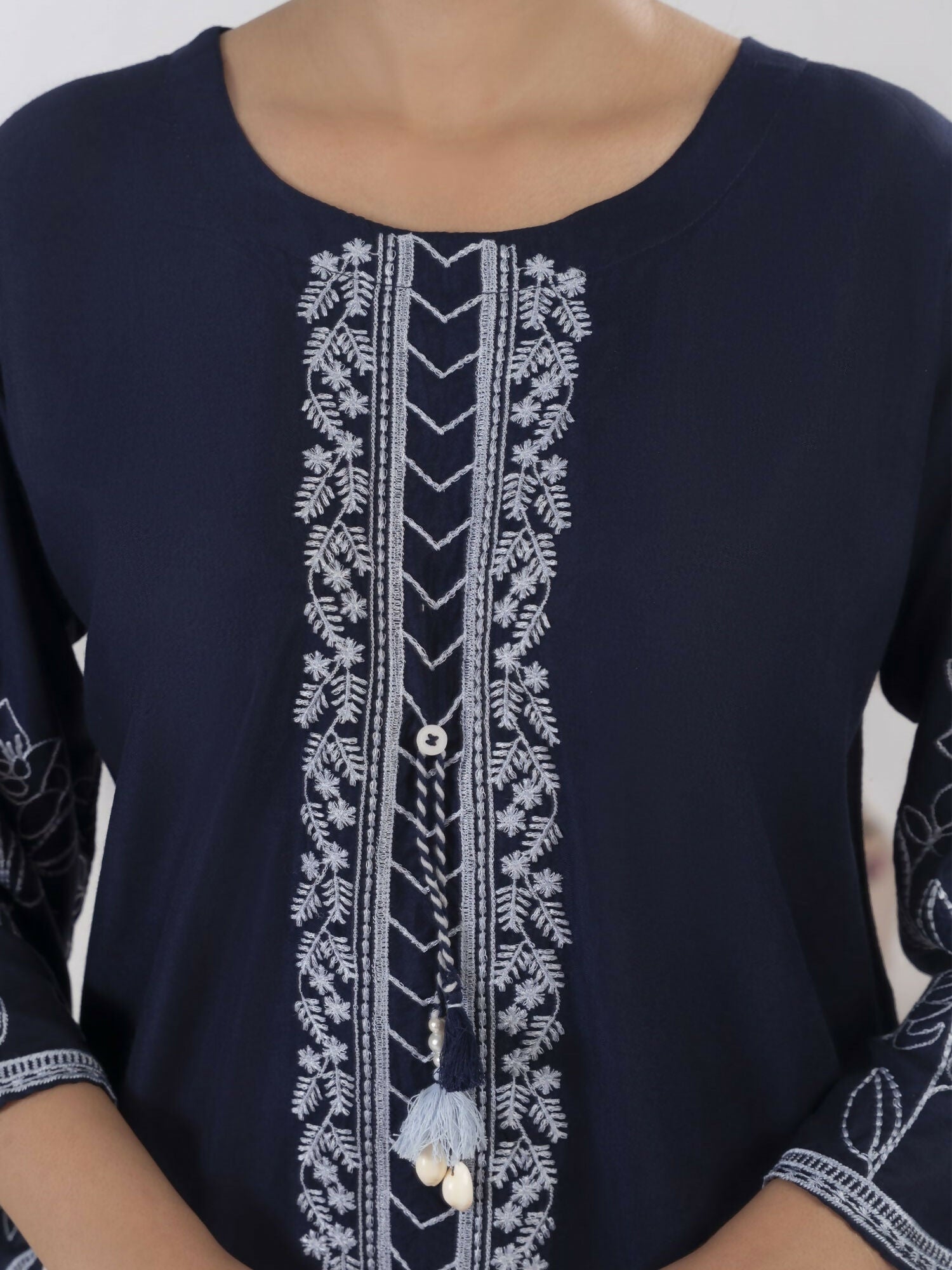 Stylish Collection Aaraish presents this embroidered 2-piece stitched kurta set – Navy Elegance, designed to offer both style and comfort for the summer season. Made from breathable linen, the navy blue straight-cut kurta features intricate embroidery and a regular fit that provides a graceful silhouette. It is paired with matching bell-bottom linen trousers, combining traditional charm with modern flair. Ideal for daily wear, this lightweight and airy set ensures you stay cool and stylish all day long.