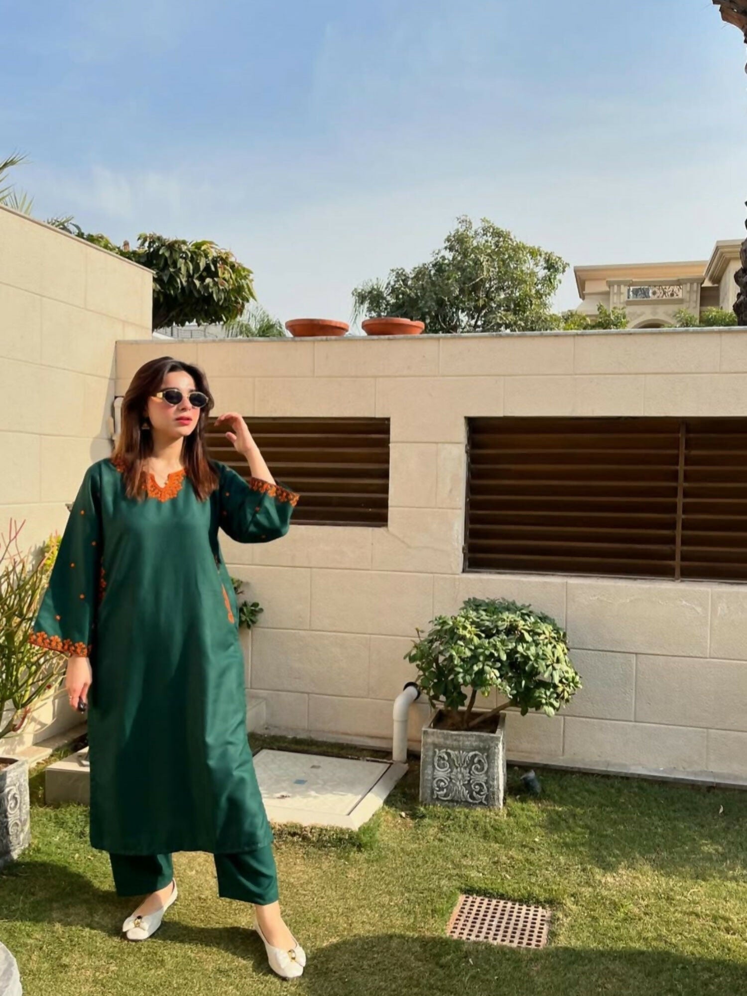Elevate your summer style with this bottle green linen embroidered 2-piece kurta set. Crafted from premium linen, the outfit offers both sophistication and comfort. The long kurta and straight trouser combination create a graceful silhouette, while the linen fabric’s hollow flax fibers allow air to circulate—keeping you cool during warm days. Ideal for daily or casual wear, this outfit blends elegance with ease.