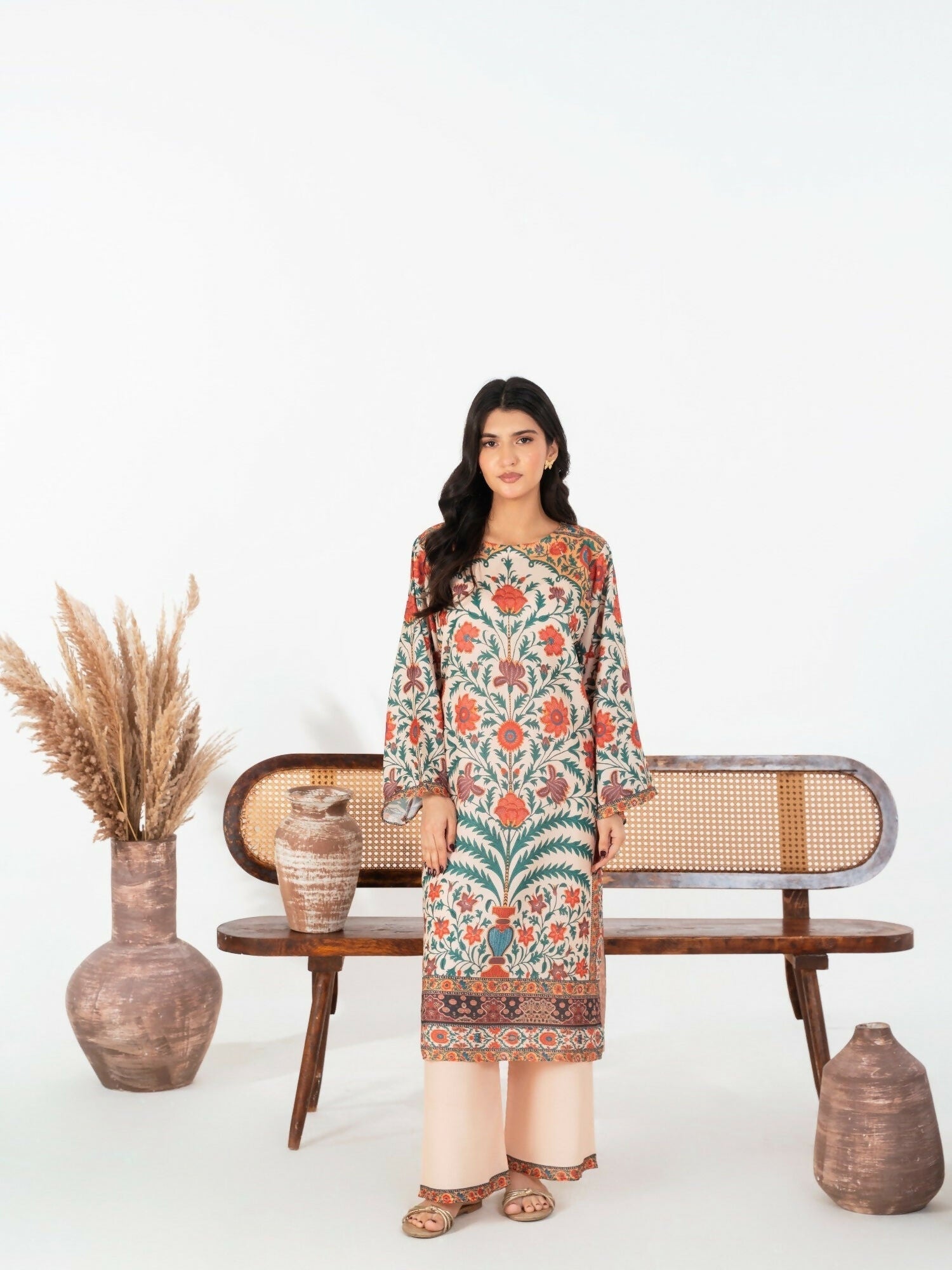 This 2-piece kurta set from Stylish Collection is designed for effortless elegance and comfort in summer wear. Crafted from soft and breathable poly lawn, the sublimation printed long kurta pairs beautifully with matching bell-bottom trousers. The subtle beige tone adds a graceful and modern charm, while the regular fit ensures practicality and ease for daily wear.