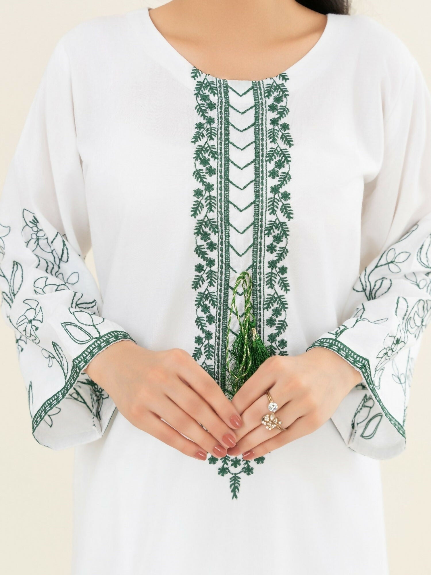 This 2-piece kurta set from Stylish Collection Saya Pret is a perfect blend of comfort and sophistication for summer wear. Crafted from breathable linen, the white embroidered straight-cut kurta offers effortless elegance in a regular fit. It is paired with matching bell-bottom trousers, creating a stylish yet comfortable outfit ideal for daily and casual occasions. The airy texture of linen allows natural ventilation, keeping you cool during warm days.