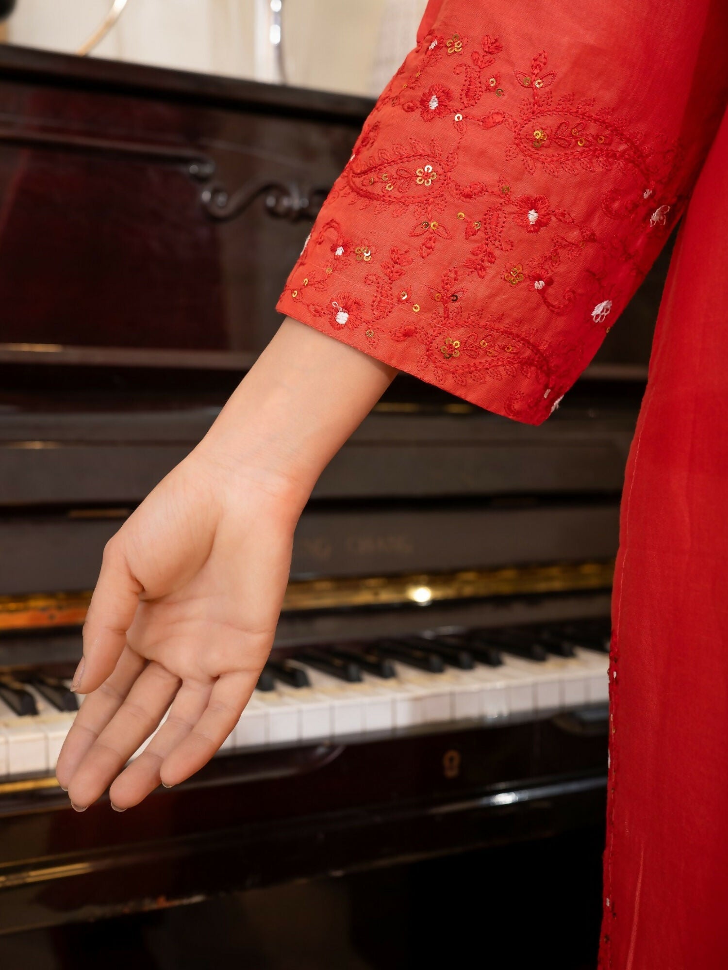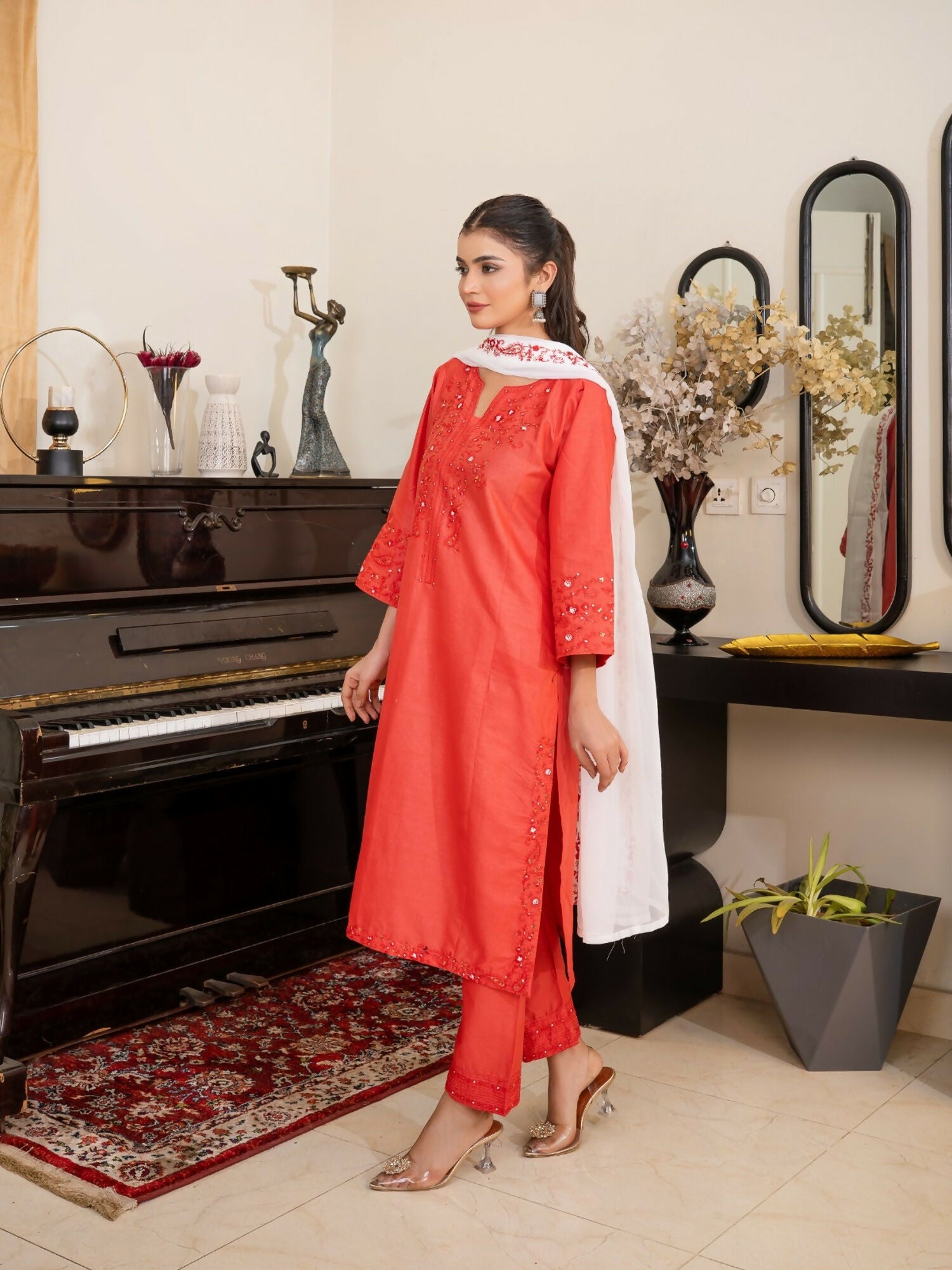 Flame Aura by Tehzeeb Libas radiates timeless elegance through its exquisite embroidered craftsmanship.The kurta features delicate tonal embroidery with subtle sequins, adding a refined shimmer that catches every light beautifully. Paired with a matching straight trouser for a sleek, coordinated look and a contrasting white chiffon dupatta adorned with intricate embroidered borders, this ensemble strikes the perfect balance between modern sophistication and traditional grace.Ideal for festive gatherings, semi-formal events, or elegant daywear, Flame Aura ensures effortless charm and refined poise.