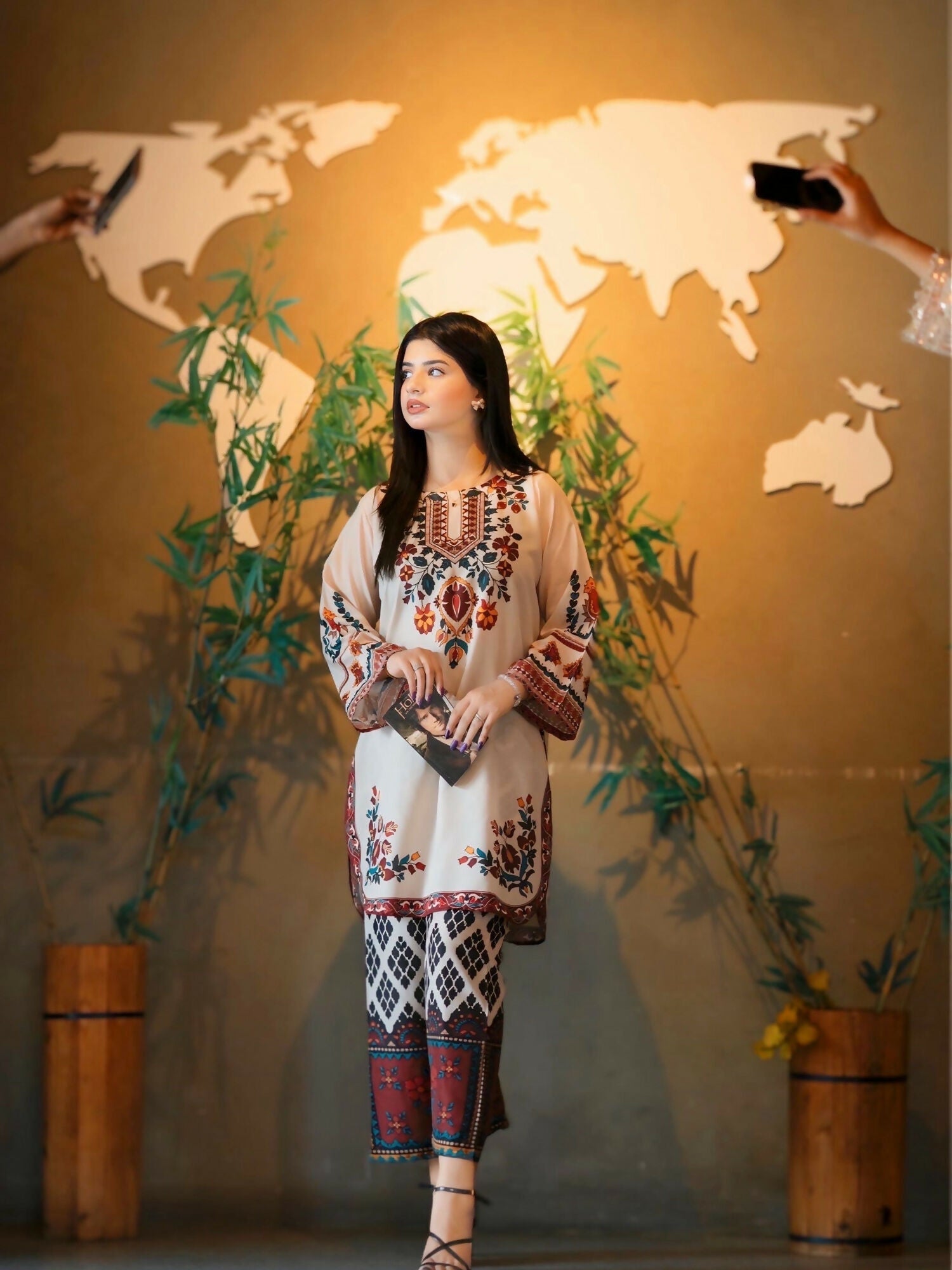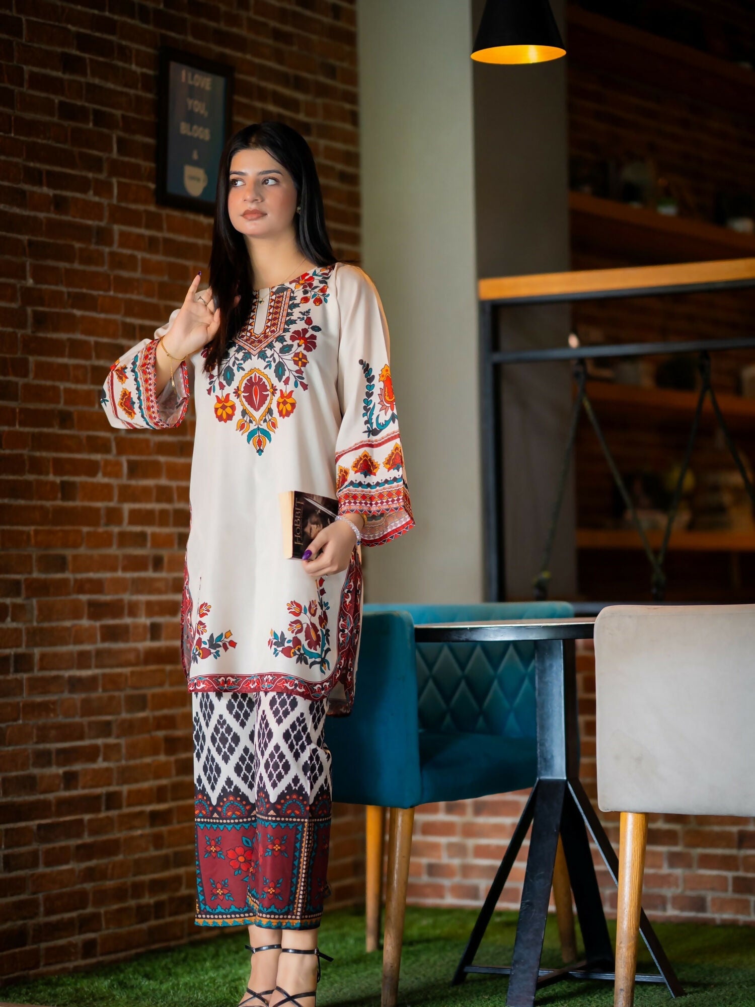 Meerub by Tehzeeb Libas celebrates ethnic beauty with a touch of modern flair in this digitally printed 2-piece cord set. The soft cream short kurta, crafted from silky lawn, is decorated with multicolored prints and vibrant tribal-floral motifs in rust, maroon, green, and teal. Detailed sleeve and hem borders add a lively charm. Paired with boldly printed culottes featuring geometric and ethnic patterns in earthy tones.