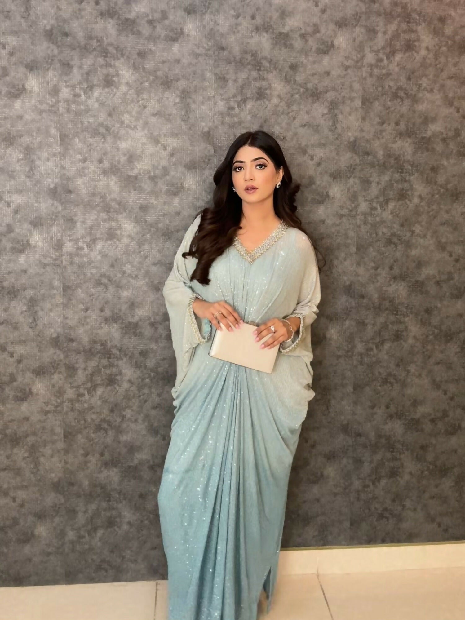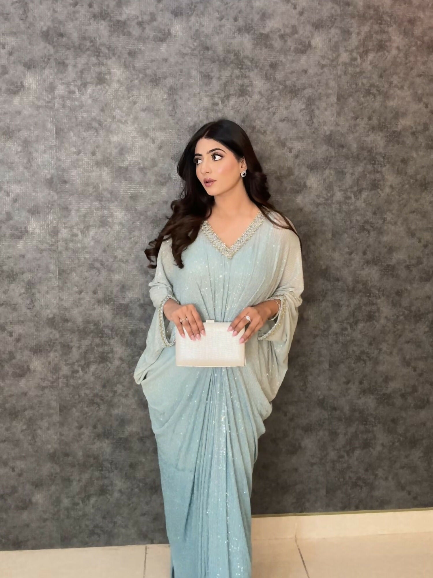 This stunning full-length net kaftan features a radiant multi-sequin design that drapes beautifully for a glamorous festive look. Paired with a soft shamoise inner for comfort and graceful fall, it offers effortless elegance for evening and formal occasions.